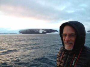 Beyond our own personal libraries, electronic or otherwise, there’s a ship’s library downstairs, assembled for this voyage, mainly by Enric, with a rich selection of practical and historical works: The Norwegian North Pole Expedition 1893-1896: Scientific Results, in six volumes, edited by Nansen; New Lands within the Arctic, an account by Julius Payer, co-leader of the Austro-Hungarian expedition of 1872-1874 that discovered Franz Josef Land and named it for the Hapsburg emperor; A Thousand Days in the Arctic, by Frederick G. Jackson, another of the earlier Arctic pioneers; Polar Microbiology, a tome supplied for our diversion by Forest Rohwer; A Complete Guide to Arctic Wildlife, by Richard Sale; and quite a few other guidebooks, monographs, and expeditionary sagas in both English and Russian. I’ve had a dip into the Payer book myself and found some interesting bits about how this place appeared in 1874. It was even colder and icier then—although, notwithstanding the presumptive impacts of climate change, which we see in the form of retreating glaciers, and which we discuss and ponder continually, it’s pretty cold and icy now too.