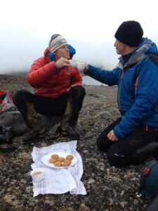 So we have devised some ways of coping. We drink a lot of coffee and tea. We share an endless supply of stories from previous adventures. We edit photographs, by the hour, on our computers and phones. We pose head-breaking riddles to the group, like that one about walking south a mile, east a mile, then north a mile and ending up exactly where you started. (It works from the North Pole, yes, but where else?) We take picnic lunches ashore, in the form of salami and cheese and brown bread, of which there seems to be no shortage, and eat them cheerily amid the rocks and the ice during pauses from the day’s walking and work. When unable to go ashore, in desperation for exercise, we resort to the “Fittnes Center,” a cabin thus labeled on the lowest deck, containing one treadmill machine and a set of barbells. We have a meeting each morning to discuss what we’re going to do and another each evening to recap what we’ve done.
