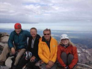 Another good friend, Paul Bertelli, signed on for this enterprise.  A strong young climber named Bud Martin, whom Paul and Conrad both knew and trusted, became our fifth.  I put myself into training with afternoon hikes, up a small mountain near home, carrying a backpack loaded with 30 pounds of canteens.  Betsy, Paul, and I also did a little technical practice, under the tutorship of Conrad and Bud, on local rock.  Despite the four decades in Montana, and with so many old ski and kayak buddies who are also climbers, I had never done any technical climbing to speak of.  But the Grand isn’t too technical, mostly just high and dramatically lovely and steep, with a bit of serious exposure.  If Conrad reckoned we could get up it, or that at least we had a reasonable chance, then I figured we were not being foolish or presumptuous to try.  He’s too smart and too sober to encourage delusional aspirations when it comes to a mountain.